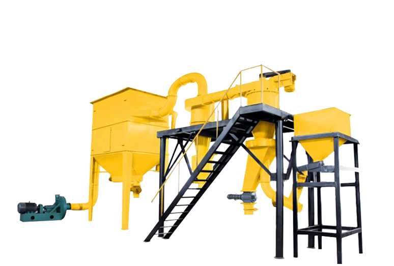 整套分級裝置由氣流分級機、旋風(fēng)收集器、脈沖除塵器、高壓引風(fēng)機、電控柜等組成。氣流分級機是帶有二次進風(fēng)及立式安裝的大葉輪轉(zhuǎn)子的強制型分級機。